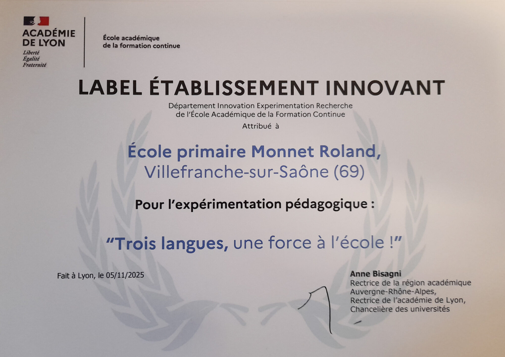Fin 2025, le groupe scolaire Monnet-Roland a obtenu une double labellisation décernée par le Département Innovation, Expérimentation et Recherche de l’École Académique de la Formation Continue. Cette reconnaissance officielle vient saluer le projet pédagogique « Trois langues, une force à l’école », porté par l’équipe enseignante et déployé à l’échelle de l’ensemble de l’établissement.