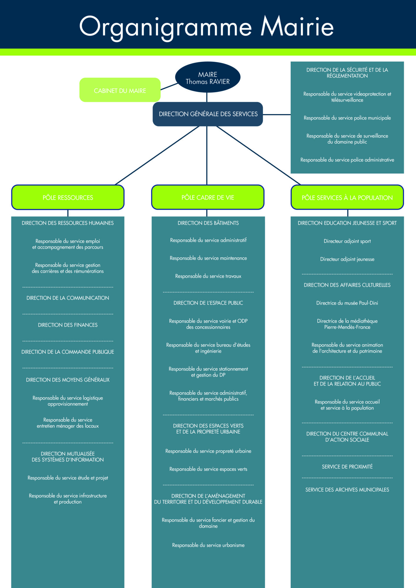 Au cœur de cette organisation, la Direction Générale des Services (DGS) assure la coordination générale des services de la collectivité avec la mise en œuvre des projets portés par les agents municipaux et les élus.