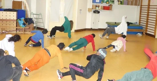 Une initiation au hip-hop est proposée aux élèves, animée par la chorégraphe du service jeunesse et deux danseurs.